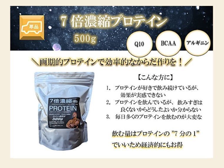 そのため少量でいつもと同量のプロテインを摂取できます。7倍濃縮プロテインは500gで通常のプロテイン3.5kgに相当します。
