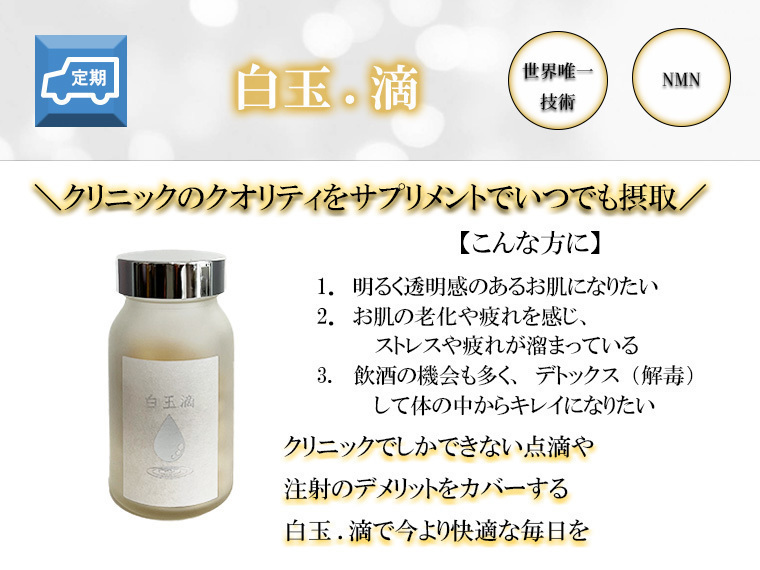 ※白玉.滴はグルタチオン単体での製剤は医療品扱いとなり、サプリメントにできないため同様に流行しているNMNと合体したサプリメントを設計しました